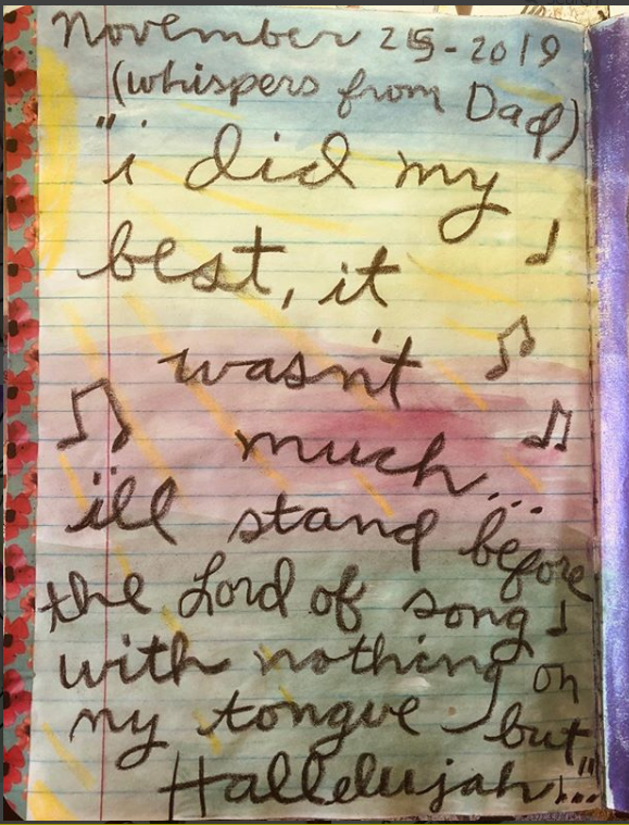 Art journaling this morning and listening to Pandora, Tori Kelly begins to sing Hallelujah. Every cell in my heart, soul and body savor each word and note. I begin to hear my father’s voice in the words and he speaks to me: